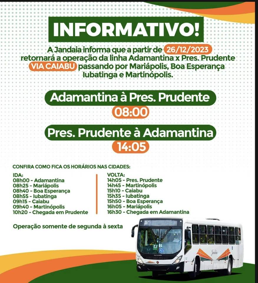 A empresa Jandaia Transportes e Turismo, irá retomar a linha suburbana entre Adamantina e Presidente Prudente. O retorno do serviço acontece a partir do dia 26 de dezembro, com operação de segunda a sexta.