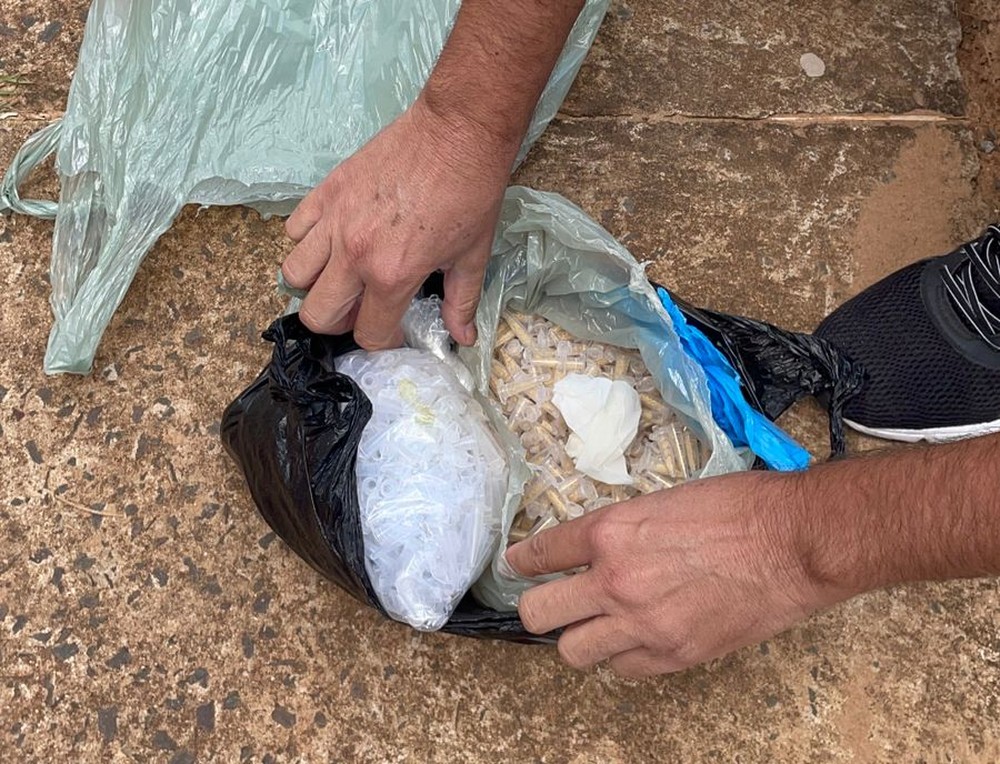Eles foram abordados pelos agentes que, durante a revista, encontraram com o pai do preso uma sacola com mais de 600 pinos de crack, 25 porções da mesma droga, dinheiro, duas munições e pinos vazios.