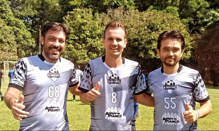 -Na foto, os jogadores Vitor Hugo, Boiago e Namba, da Alamandas F.C.