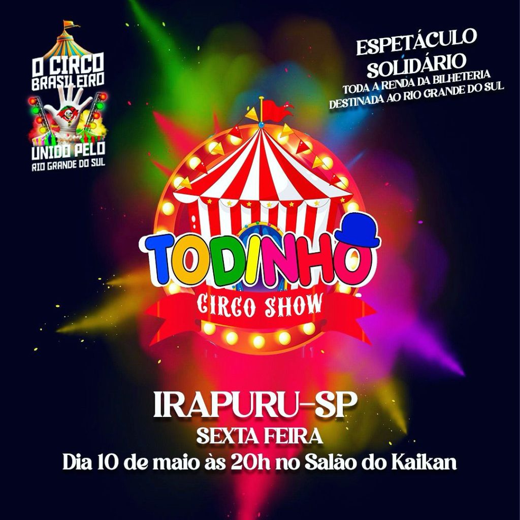 O palhaço irapuruense Todinho promove nesta sexta-feira (10), apresentação circense com foco na arrecadação de doações em dinheiro para os atingidos pelas enchentes no Rio Grande do Sul. O show acontecerá no Salão do Kaikan de Irapuru a partir das 20h. O ingresso individual custará R$ 5,00.