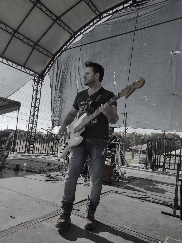 Ele relatou que começou no seguimento musical aprendendo violão com revistinhas que vendiam nas bancas nos anos 90. Daí anos depois, com colegas de infância montaram uma banda para tocar covers estilo Rock n Roll, os ensaios eram em um barracão que seu pai tinha na época.