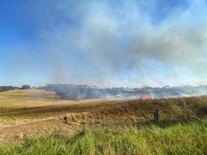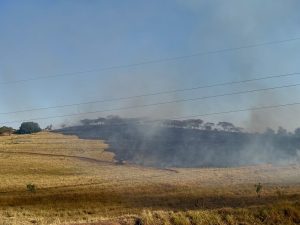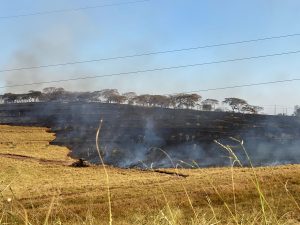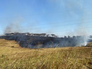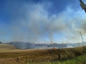 Um incêndio de grandes proporções está atingindo uma propriedade rural nas margens da rodovia SP-294, em frente à Mata da Santana, em Flórida Paulista.