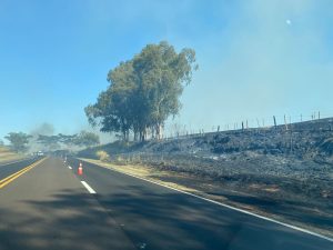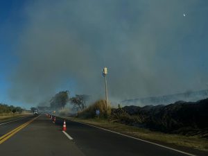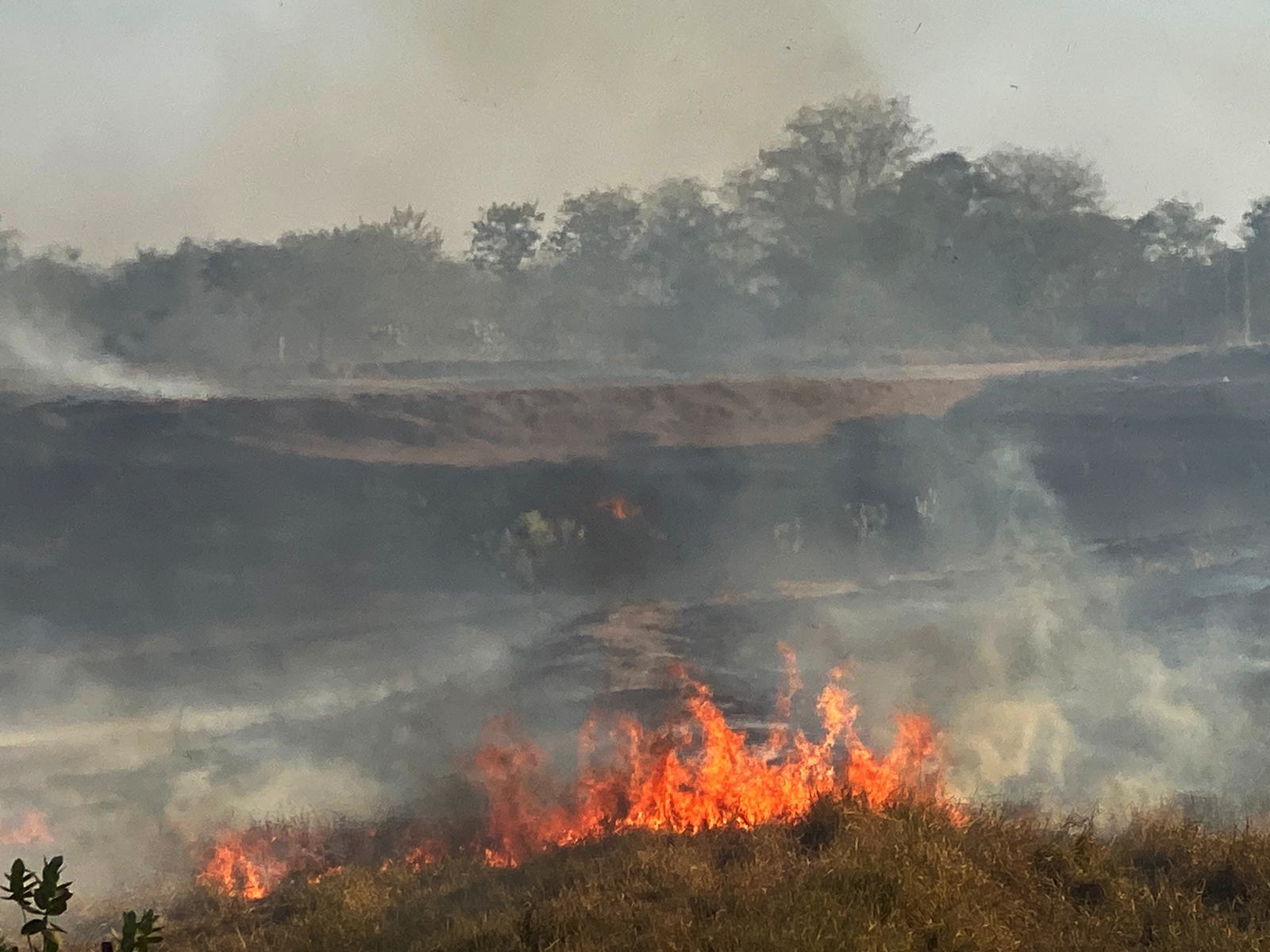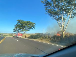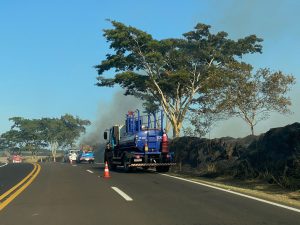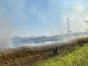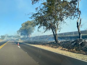 Uma equipe da Polícia Militar Rodoviária está no local e alerta os motoristas a redobrarem a atenção ao transitar pelo trecho devido à intensa fumaça e à visibilidade reduzida.