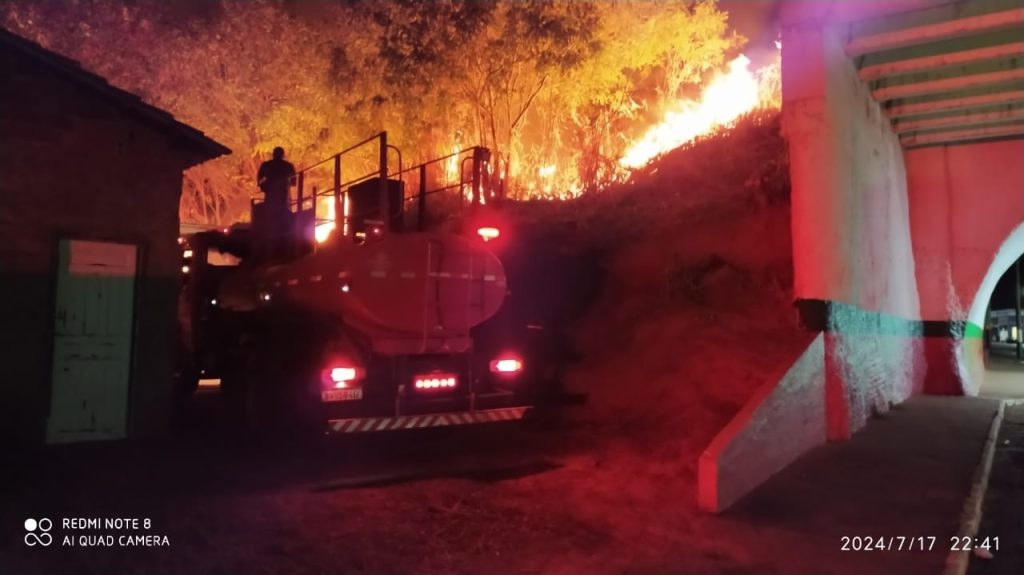 No início da madrugada de ontem, um incêndio em vegetação ocorreu sobre o pontilhão da entrada da cidade, quase afetando uma casa localizada às margens do local.