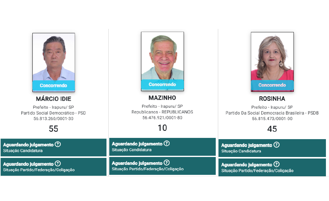 Conforme havia sido definido nas convenções partidárias, não houve mudanças e desta forma três candidatos a prefeito e vice de Irapuru pediram o registro de candidatura na Justiça Eleitoral.