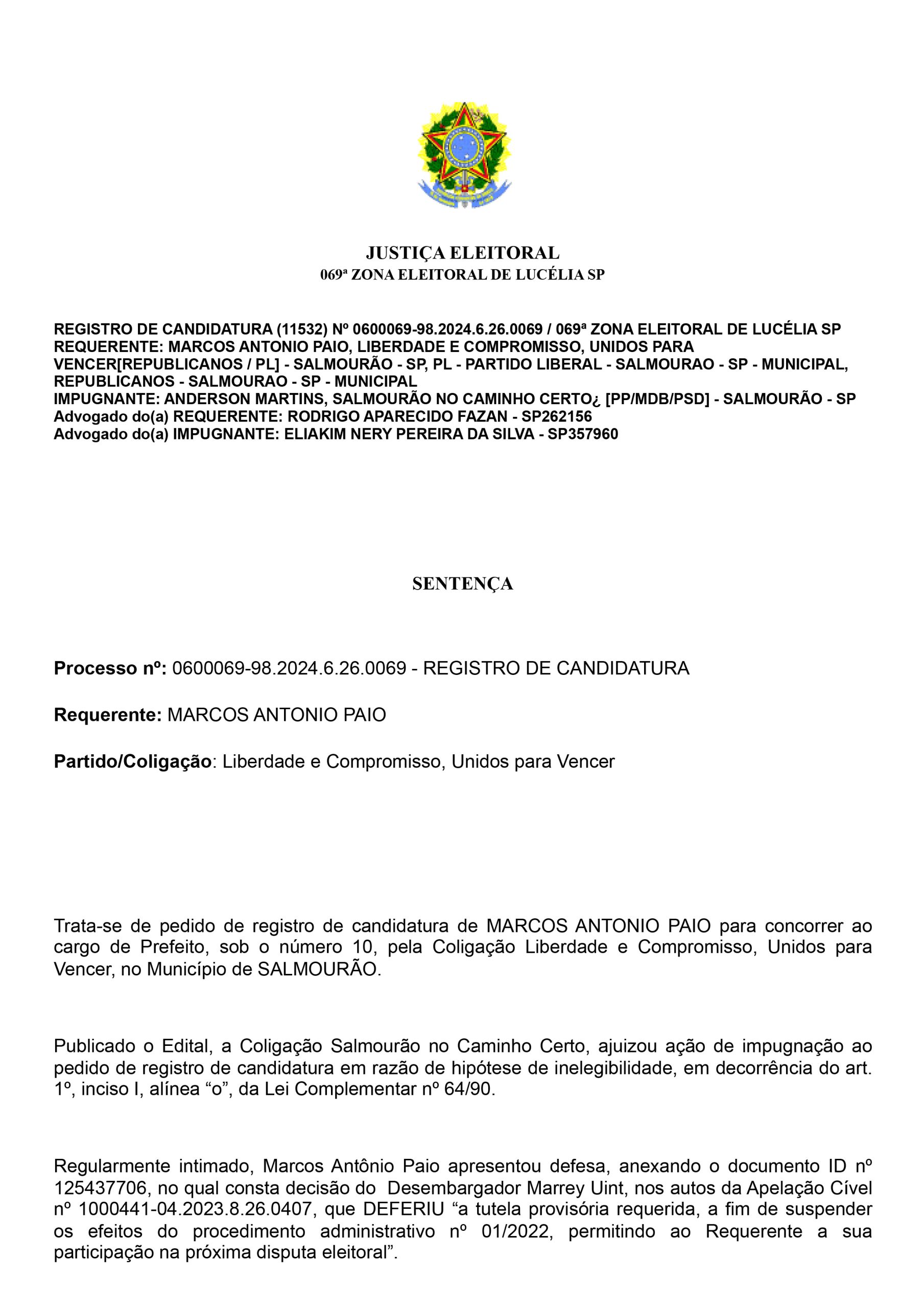 Em mais um passo decisivo para as eleições municipais de 2024, Marcos Antônio Paio (Marquinhos), do Partido Republicanos, teve sua candidatura a prefeito deferida pela Justiça Eleitoral. A decisão confirma a elegibilidade do candidato, permitindo que ele continue sua campanha em busca do cargo de prefeito de Salmourão para o mandato 2025 à 2028.