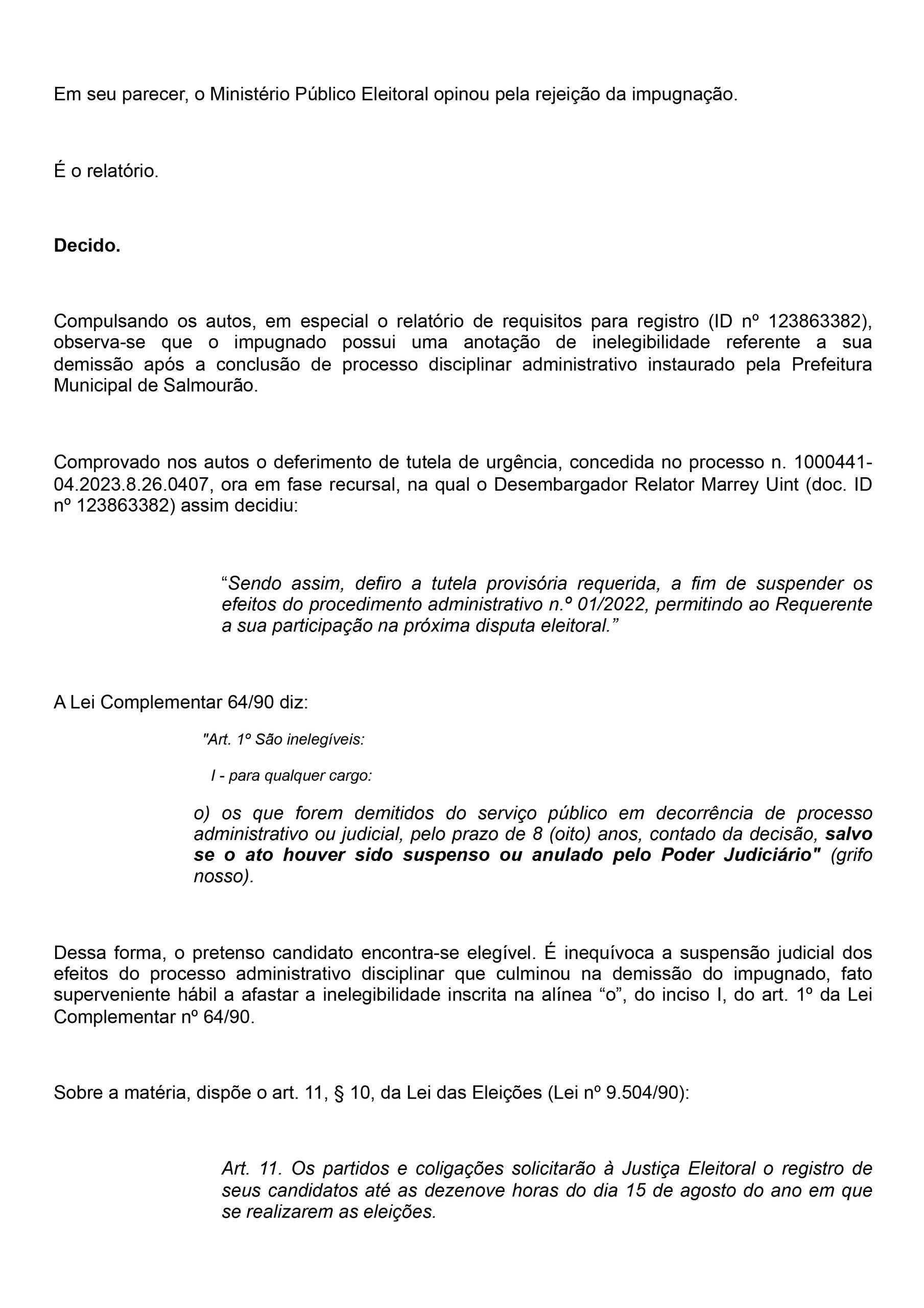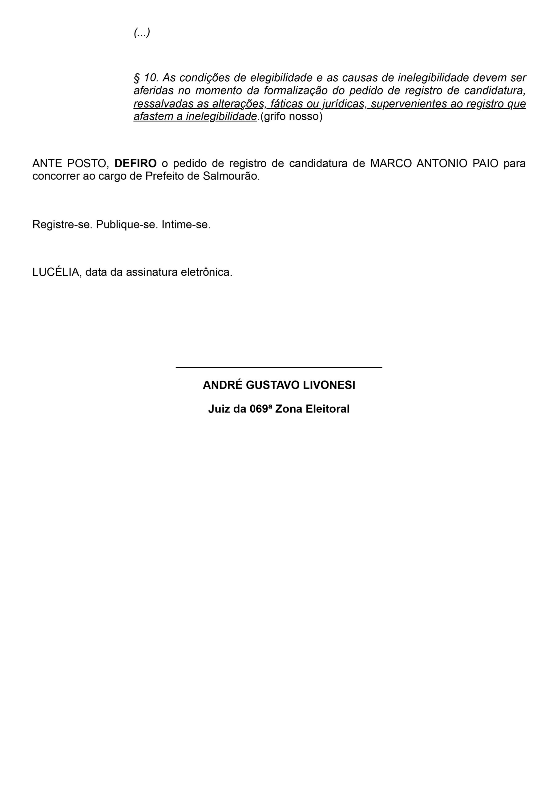 A coligação adversária na eleição municipal havia entrado com pedido de impugnação da candidatura de Marquinhos na Justiça Eleitoral da Comarca, porém foi comprovado que o candidato do Republicanos está com os seus direitos políticos em ordem, podendo concorrer ao cargo de prefeito na eleição deste ano.