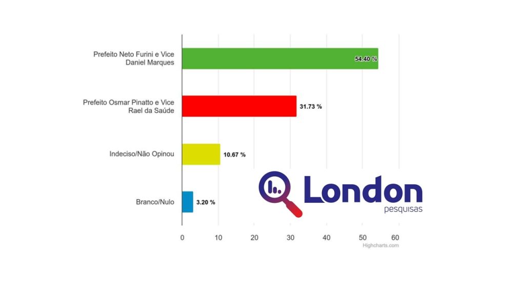 Através de pesquisa de opinião pública realizada nos dias 22 e 23 de setembro, pela empresa London Pesquisas – PR (www.londonpesquisas.com.br), com registro no Tribunal Superior Eleitoral sob número SP-08796/2024, aponta em Junqueirópolis, uma vantagem do candidato a prefeito Neto Furini e do candidato a vice-prefeito Daniel Marques (Coligação “Novo Futuro Para Junqueirópolis” com os partidos REPUBLICANOS / MDB / UNIÃO), contra o candidato a prefeito Osmar Pinatto e do vice-prefeito Rael da Saúde (Coligação “Experiência e Inovação”, com os partidos PSD / NOVO / PL/ Federação PSDB/CIDADANIA).
