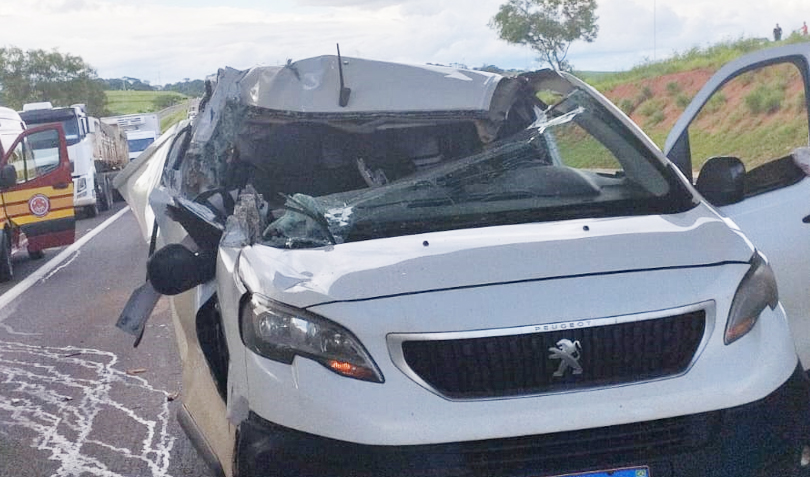 A van ficou com a frente bastante danificada, incluindo o teto.