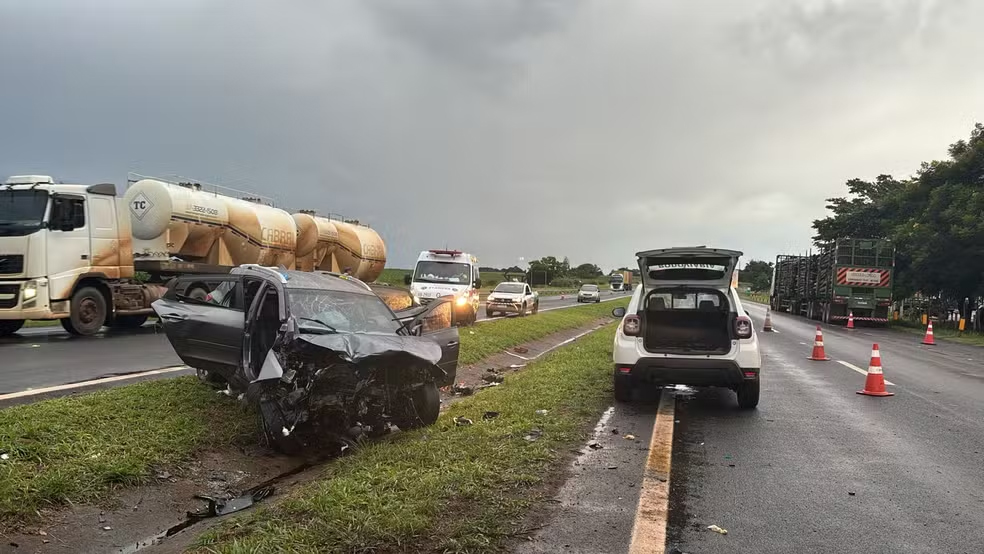 De acordo com o boletim de ocorrência, o motorista da carreta, com placas de Belo Horizonte (MG), saía de um posto às margens da rodovia quando o automóvel, com placas de Ibaté (SP), que seguia no mesmo sentido, bateu na lateral dela.