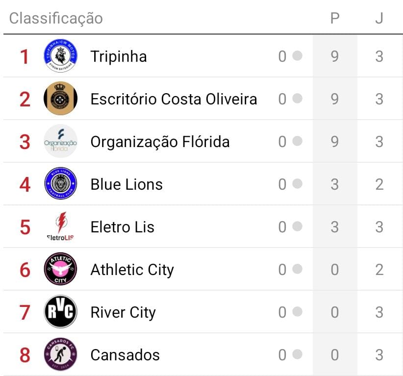 A quinta rodada irá acontecer já nessa terça feira (21) com mais três jogos, começando a partir das 19h15 no jogo entre Blue Lions contra Escritório Costa Oliveira/Giba’s. Logo em seguida Cansados FC tentará tirar a invecibilidade da Organização Flórida de Contabilidade. E para encerrar mais uma rodada terá um jogo que promete ser muito acirrado, onde o Athletic City enfrentará o Escritório Cruzeiro do Sul/River City.