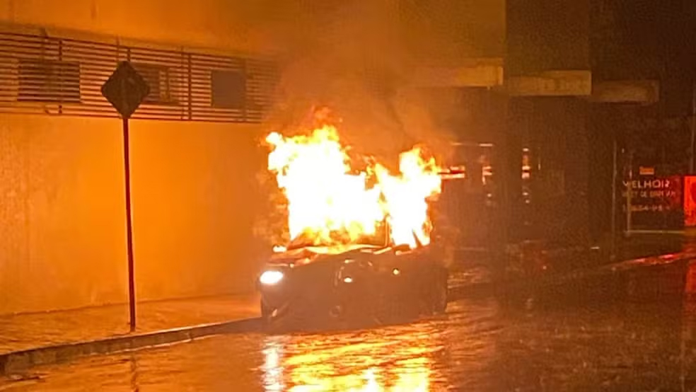 O carro do idoso de 61 anos envolvido no acidente com a motociclista prensada por dois veículos em Birigui (SP) foi incendiado na madrugada desta quarta-feira (5). Uma câmera de segurança registrou o acidente.