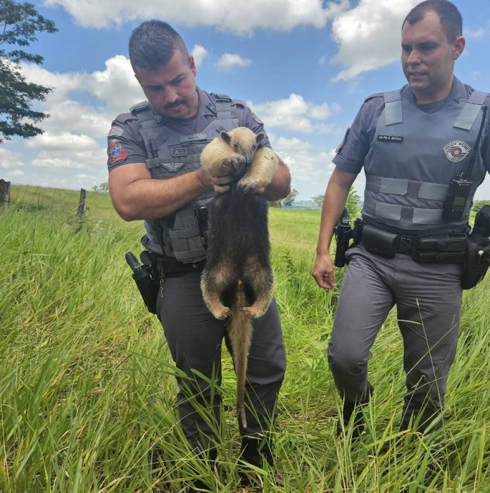 Com apoio do Setor de Zoonoses da Prefeitura, que também recebeu a informação, os militares realizaram buscas nas proximidades da área indicada, localizando o tamanduá-mirim em um pasto em estado fragilizado devido a um possível atropelamento.