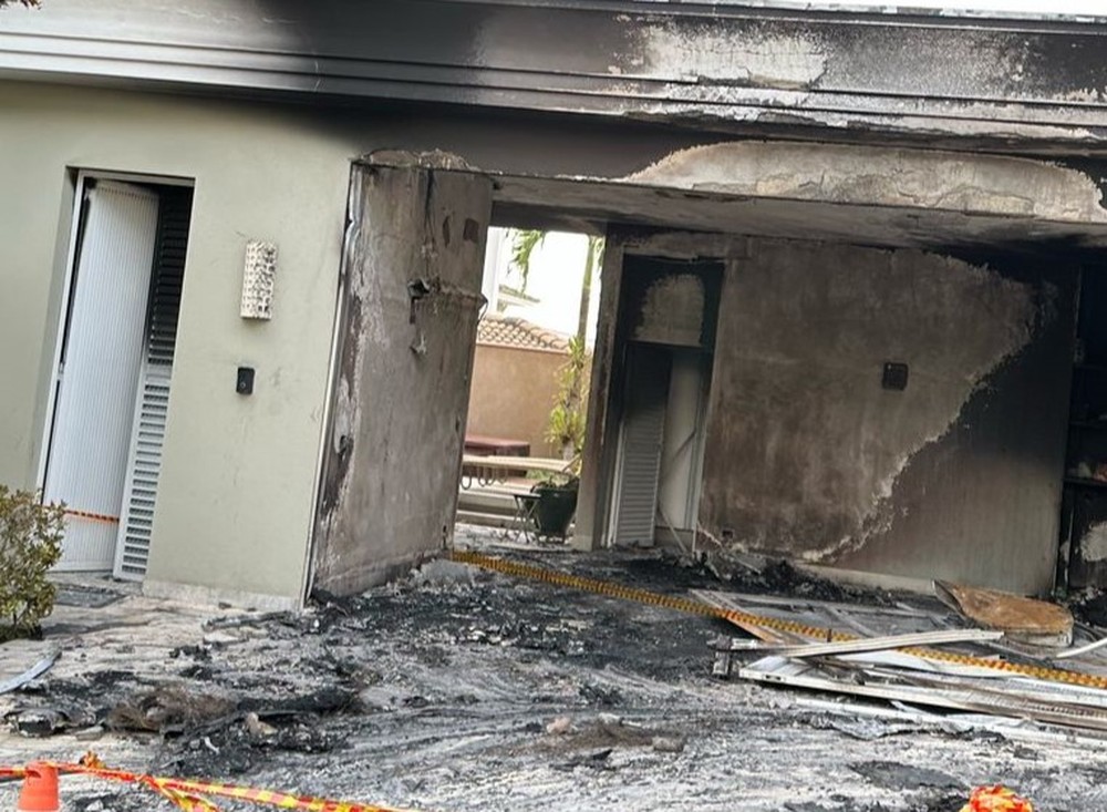 Com a chegada das viaturas no local, os bombeiros informaram que o veículo estava totalmente tomado pelo fogo, que também atingia o teto da garagem e irradiava para a fiação elétrica de um poste de energia próximo, ocasionando queda de fio energizado em frente a garagem.