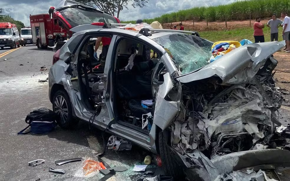 Imagens que circulam nas redes sociais mostram os veículos completamente destruídos e várias pessoas tentando ajudar as vítimas presas nas ferragens de um dos carros.