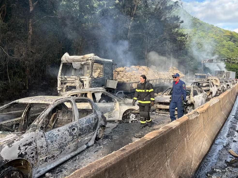 Até 17h30, os bombeiros seguiam no local no rescaldo dos incêndios em caminhões atingidos. Também foi iniciada a retirada das árvores que estão à margem da rodovia e foram atingidas pelas chamas.
