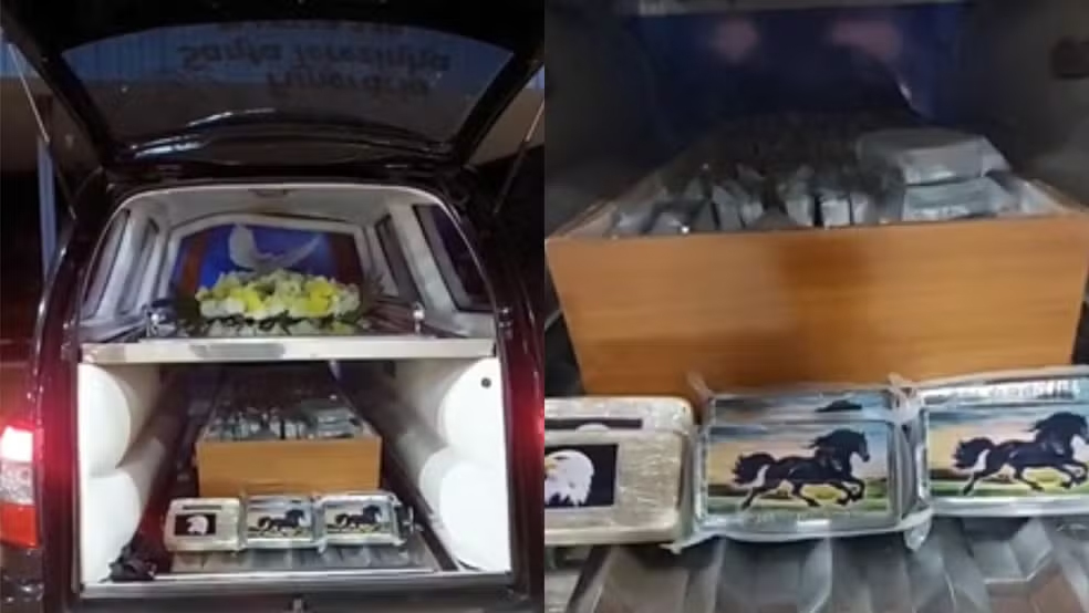 Um motorista de um carro funerário foi preso em flagrante por tráfico de drogas na noite de quinta-feira (29) na BR-262, em Terenos (MS). A Polícia Rodoviária Federal (PRF) encontrou 162,37 quilos de cocaína dentro do caixão que estava na carroceria do veículo. A identidade do suspeito não foi divulgada.