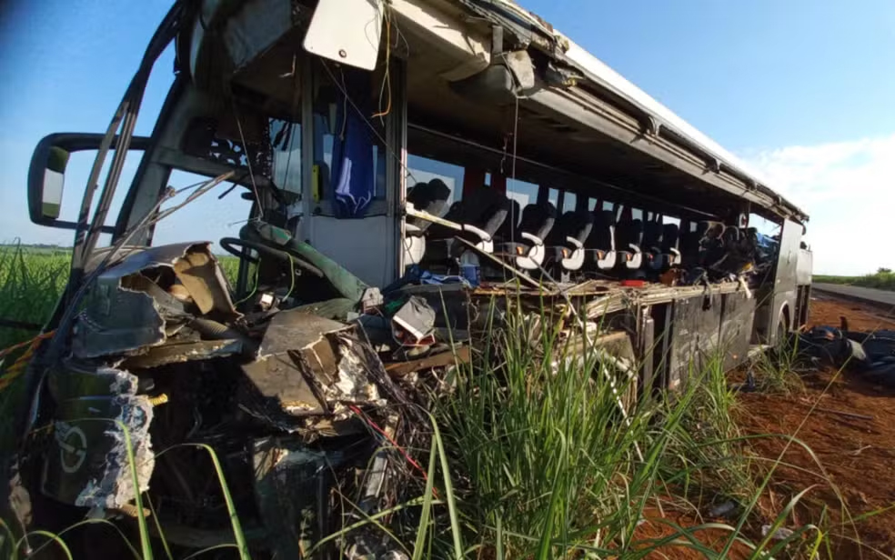 O ônibus, com 29 estudantes e o motorista, bateu com o caminhão que invadiu a contramão. Com o impacto, a lateral ficou completamente destruída.