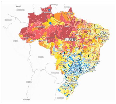 Cumpre destacar que, quando comparamos estes municípios ao restante do país, a nossa região ainda apresenta bons resultados (cor azul) (Vide Mapa 2). E com isso, vale a análise da Região Norte, a qual apresenta os piores indicadores nacionais (cor vermelha).