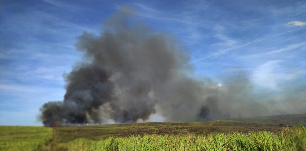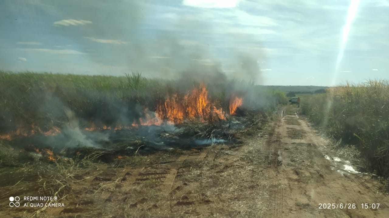 As chamas se alastraram rapidamente pela vegetação e canavial, atingindo uma área próxima ao Rio do Peixe, gerando preocupação.