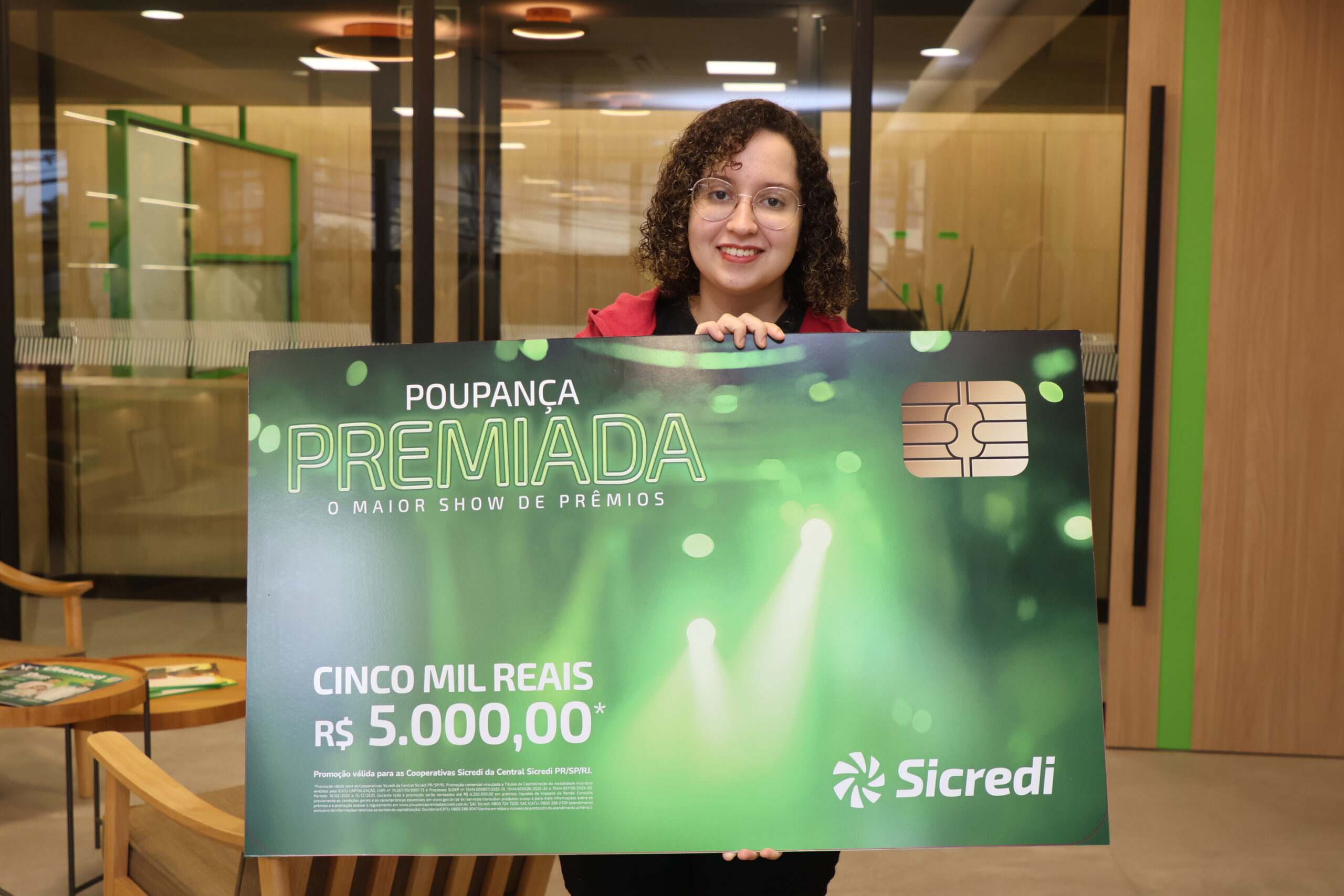 A campanha Poupança Premiada Sicredi premiou com R$ 5 mil uma poupadora da Sicredi Centro Oeste Paulista de Marília/SP. A estagiária e estudante Wanessa Pereira recebeu o cheque simbólico no dia 03 de junho, após a validação do sorteio por auditoria externa.