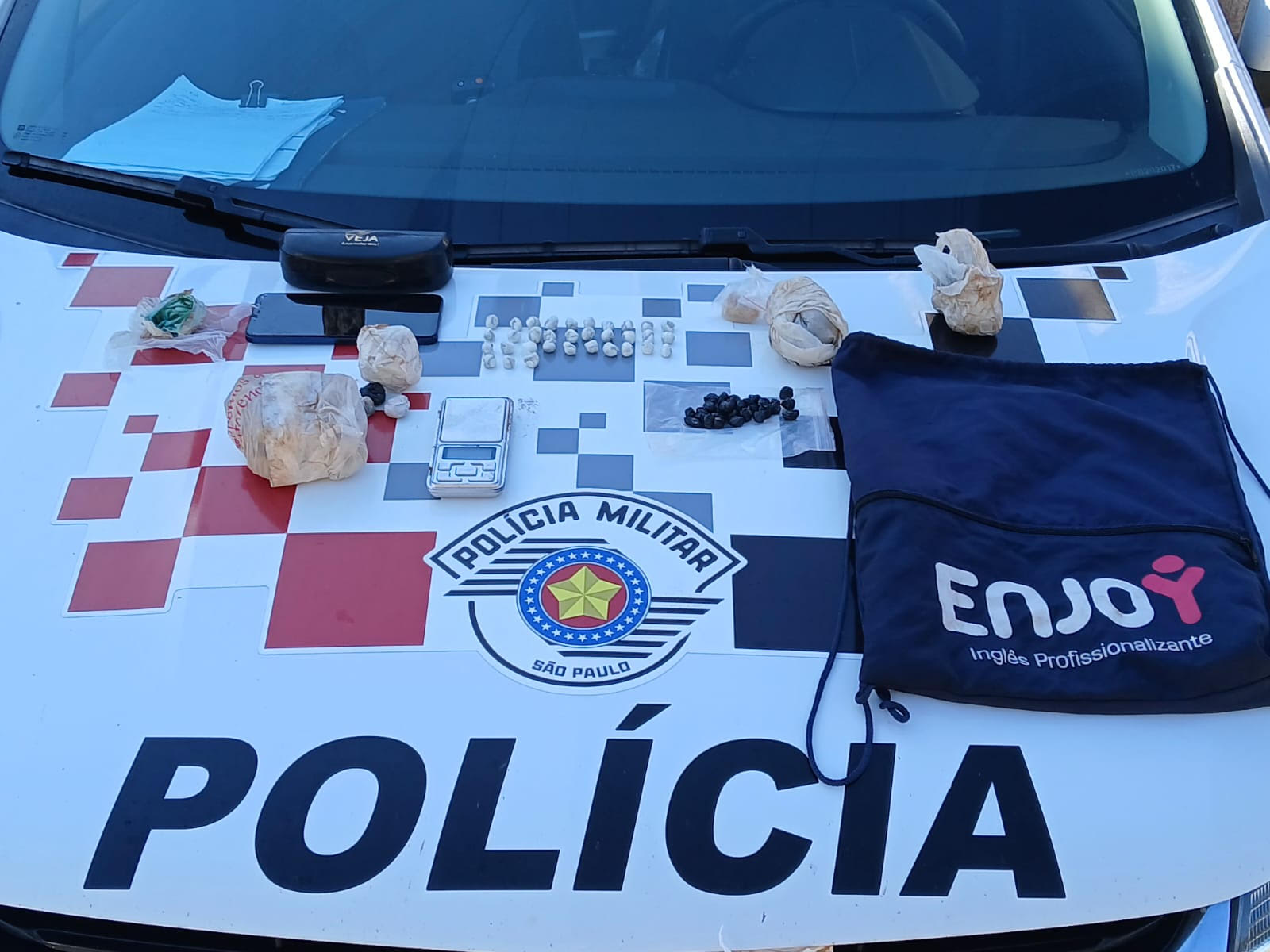 A bolsa foi apreendida e continha: 33 porções de cocaína fracionadas e 1 porção não dividida; 26 porções de crack e uma pedra bruta da mesma droga; três tabletes de maconha mais 3 porções adicionais; uma balança de precisão e um aparelho celular.