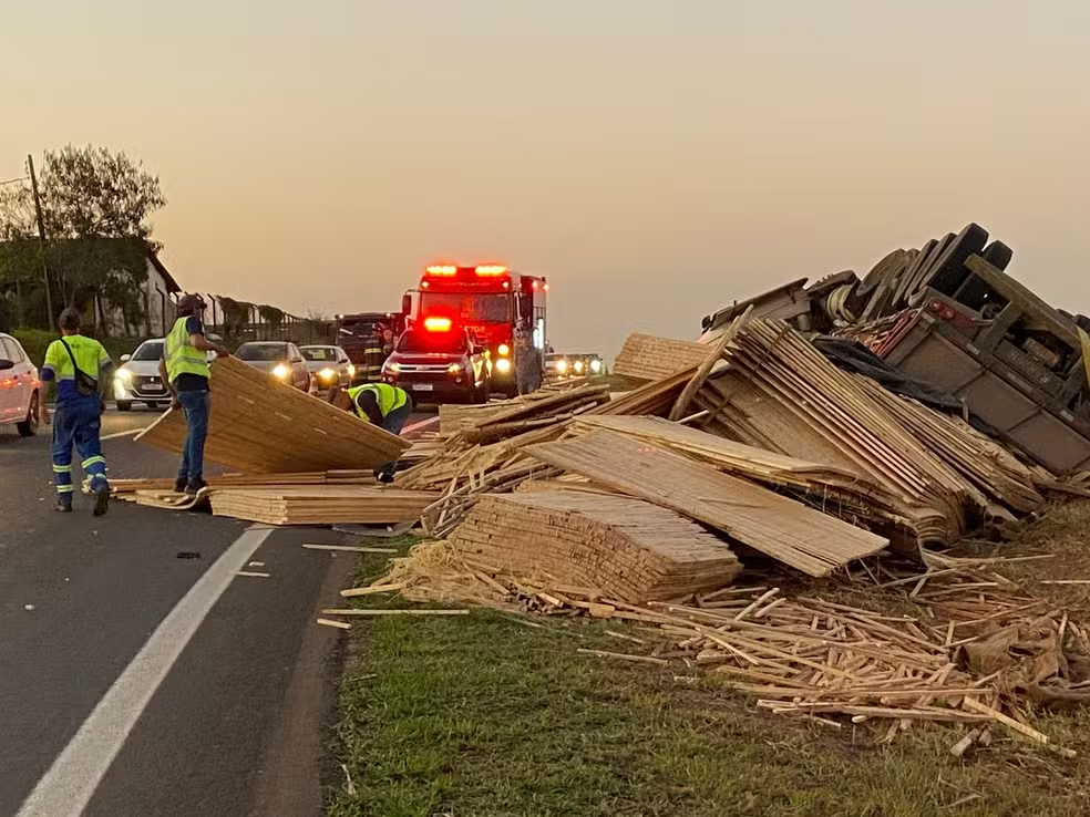 Um caminhão carregado com madeira tombou no Anel Viário de Piracicaba (SP), na Rodovia Ernesto Paterniani, próximo ao km 162, na tarde desta segunda-feira (7). O acidente ocorreu na altura do entroncamento com a Rodovia Luiz de Queiroz (SP-304). Até às 7h45 de terça-feira (8), o veículo permanecia no local.