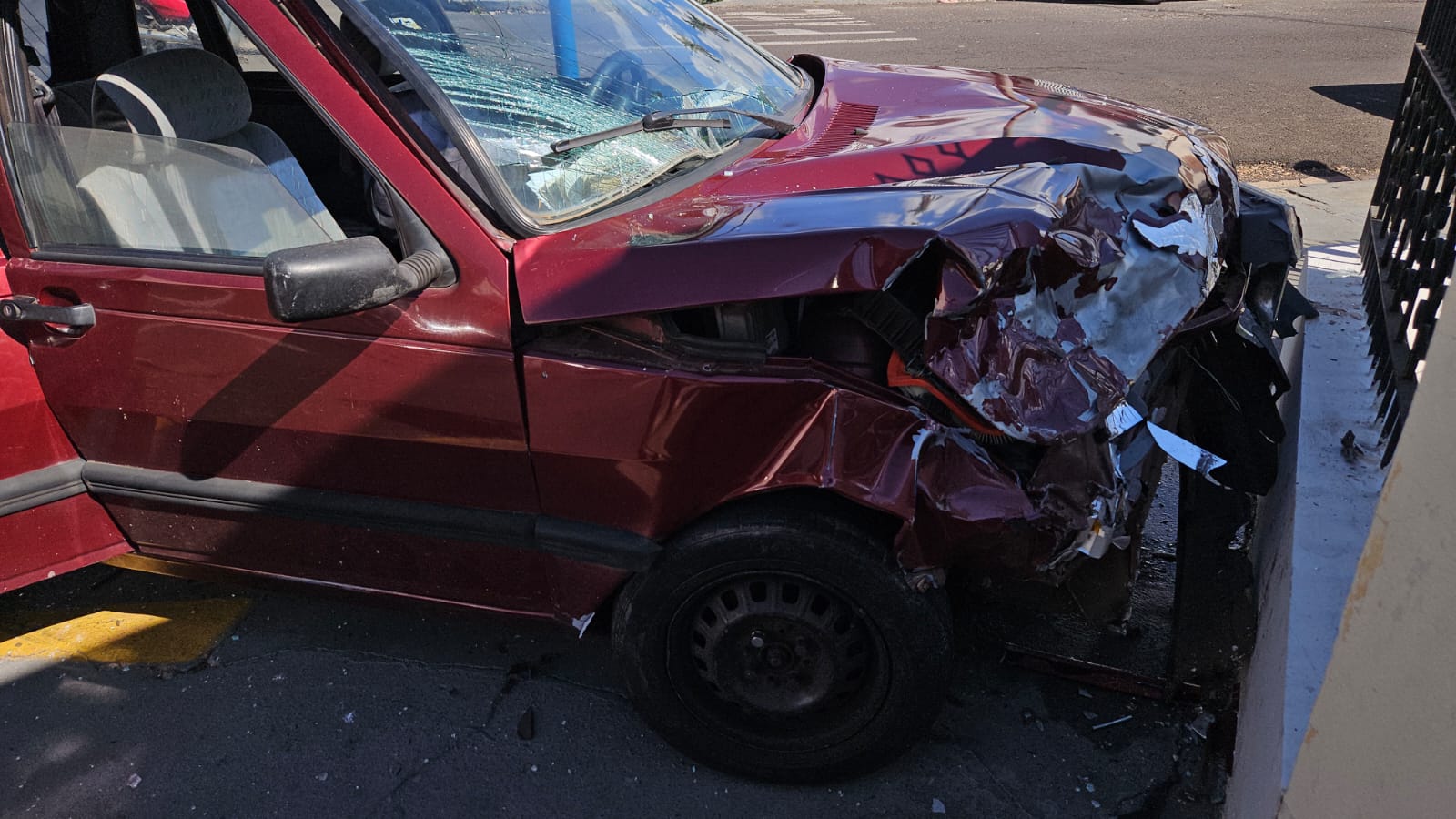 O Uno ainda atingiu o muro de uma residência. Felizmente ninguém ficou ferido, apenas danos nos três carros.