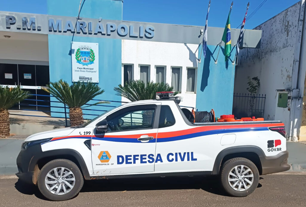 A Prefeitura de Mariápolis recebeu, na semana passada, uma nova viatura destinada ao fortaleci-mento das ações da Defesa Civil Municipal. A entrega oficial aconteceu na sede do Governo do Estado de São Paulo e contou com a presença do prefeito Ricardo Watanabe, do vice-prefeito Gil-son Paulo e do vereador João Luiz Aparecido Belloni.