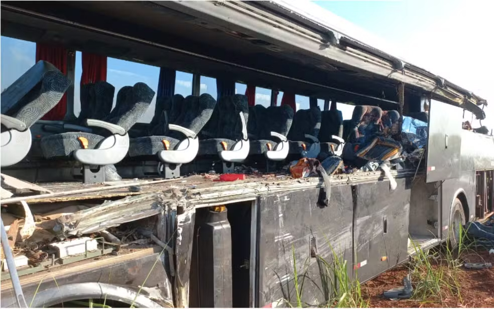 O ônibus, com 29 estudantes e o motorista, bateu com um caminhão que vinha no sentido oposto na pista, invadindo a faixa em que estavam. O impacto deixou a lateral do ônibus completamente destruída.
