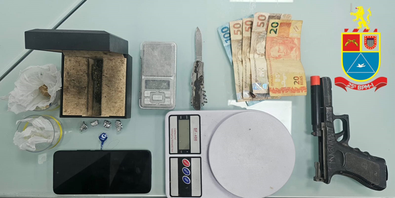 O adolescente confessou ter mais drogas em casa. Na residência, com a autorização e acompanhamento da mãe e do padrasto, os policiais apreenderam porções de cocaína, crack e maconha, duas balanças de precisão, embalagens plásticas, papel alumínio e um simulacro de arma de fogo.