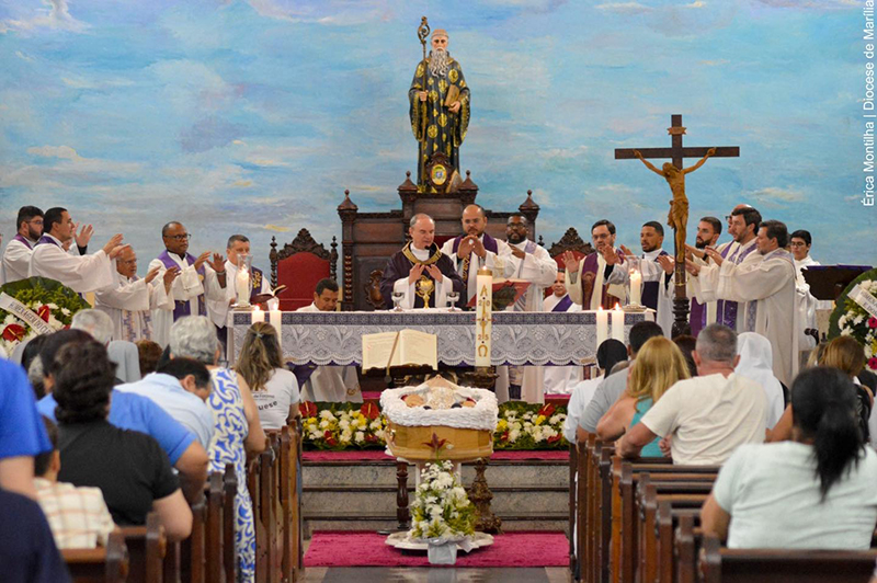 A chegada do féretro foi acompanhada pelas orações dos fiéis, ministros ordenados e de religiosos. Logo após, uma primeira Missa foi presidida pelo bispo diocesano de Marília, Dom Luiz Antonio Cipolini.
