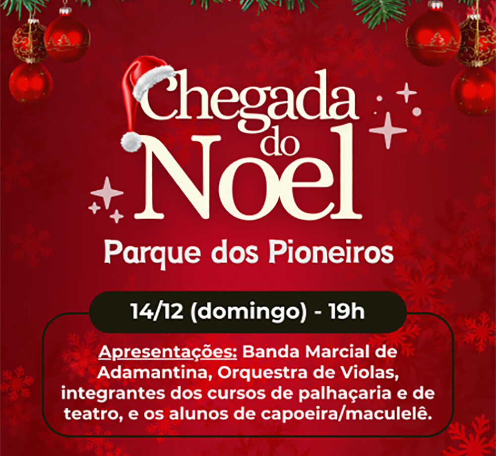 Domingo (14), a partir das 19h no Parque dos Pioneiros será realizada uma ampla programação com o objetivo de receber o Papai Noel em Adamantina. A expectativa da chegada do “Bom Velhinho” é logo após o musical “Natal Brasileiro”.
