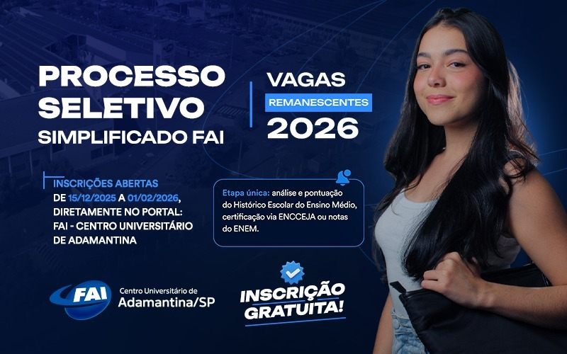 Estão abertas as inscrições do Processo Seletivo Simplificado do Centro Universitário de Adamantina, que preencherá as vagas remanescentes para o primeiro semestre letivo de 2026. As inscrições são totalmente gratuitas e começam hoje, dia 15, pelo site oficial da instituição (www.fai.com.br).