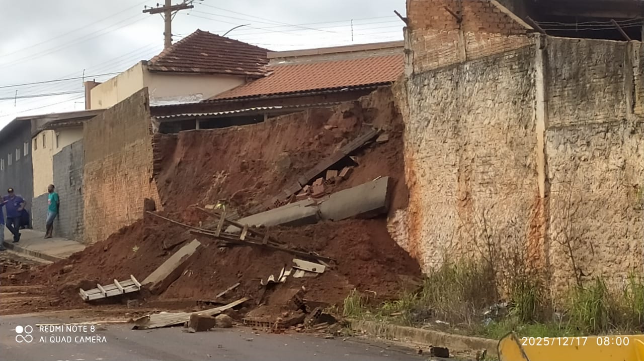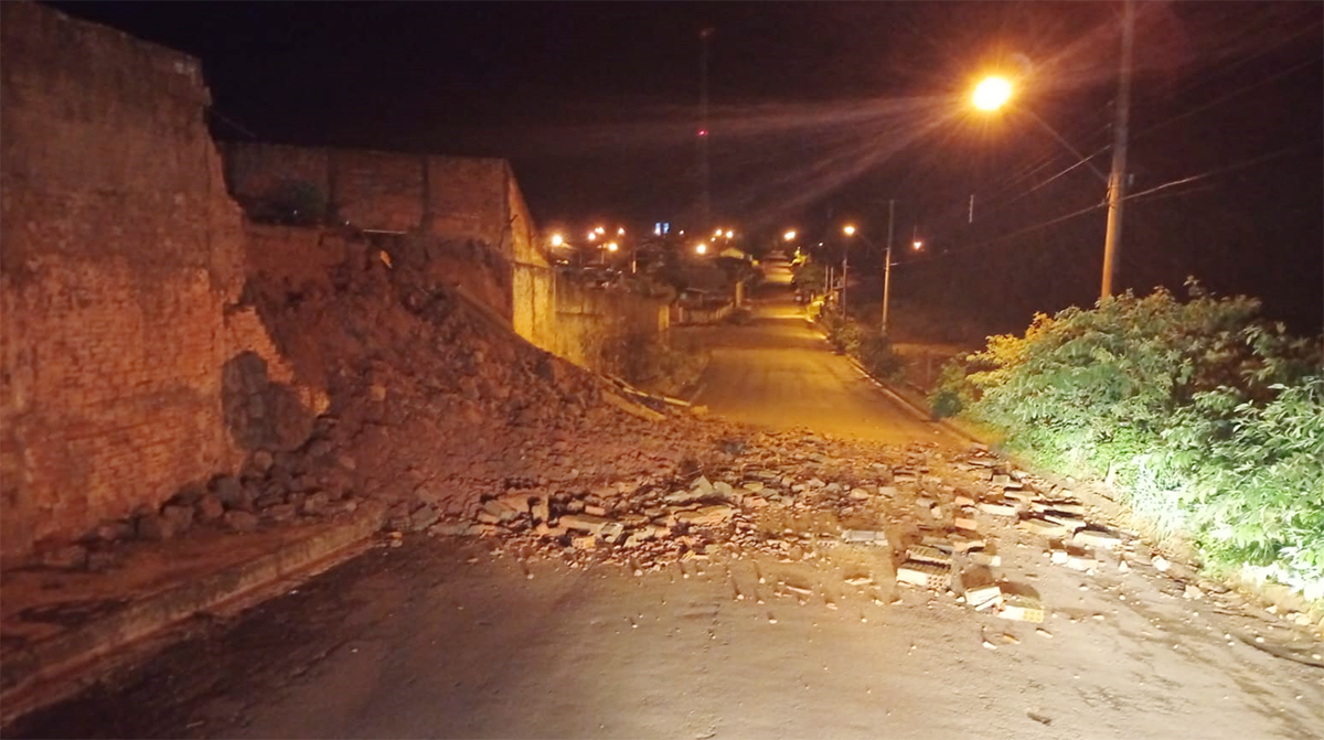 Na noite desta segunda-feira (16), um muro de uma residência desmoronou, provocando um forte barulho e resultando em um grande acúmulo de terra que acabou interditando parte da Avenida Augusto Roque, próximo ao Posto Cardoso.