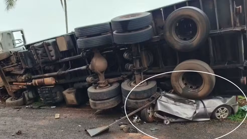 Segundo a Polícia Militar Rodoviária (PMR), o motorista de um caminhão contou que perdeu o controle da direção, rodou na pista, bateu na lateral de um carro e tombou em cima dele.