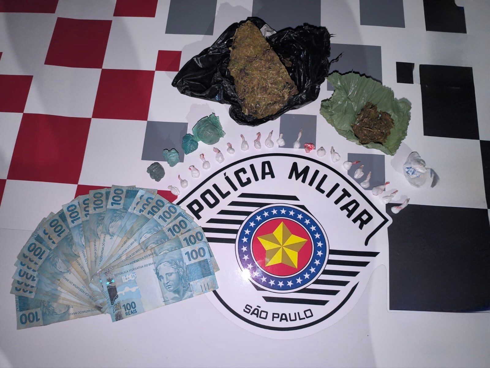 Em entrevista, a passageira informou estar com a quantia de R$ 2.200,00 em notas diversas. Na busca veicular, sob o banco do motorista, foi encontrada uma sacola plástica contendo cinco porções de maconha e um pedaço maior da mesma substância.