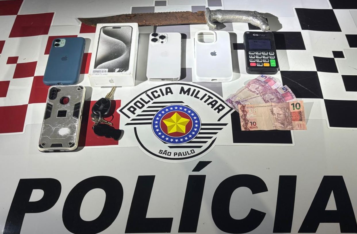 O suspeito resistiu à prisão e foi contido. No veículo utilizado pelo grupo, a PM encontrou a faca usada no crime e R$ 20 em dinheiro. Ao todo, três indivíduos foram detidos, um veículo e objetos foram apreendidos, e os bens roubados foram recuperados.