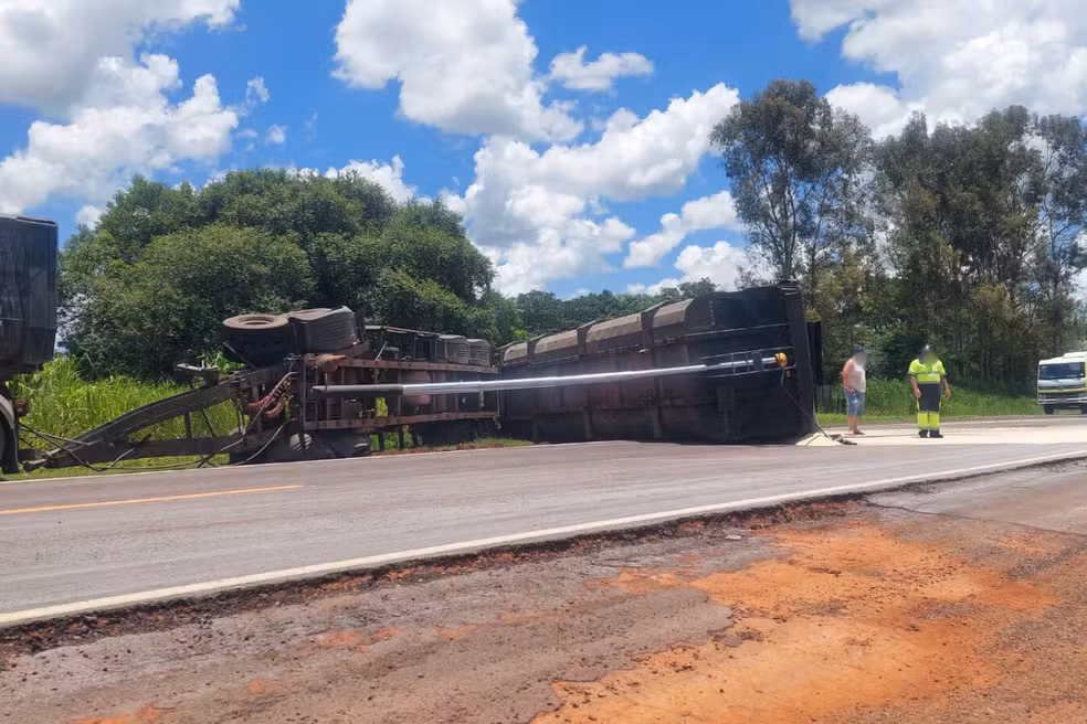 O tombamento de uma carreta carregada com açúcar interditou um trecho da Rodovia Euclides de Oliveira Figueiredo (SP-563), em Dracena, no início da tarde desta segunda-feira (19).
