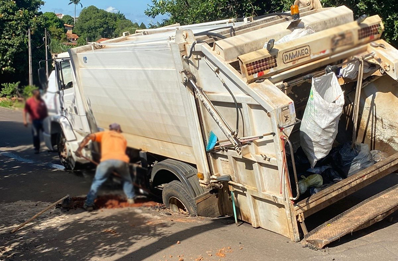 Um caminhão da coleta de lixo domiciliar afundou no asfalto na manhã desta terça-feira (17), em Irapuru. O incidente foi registrado na Rua Dona Chiquinha de Farias, nas proximidades do “Bernal”, na região central da cidade.