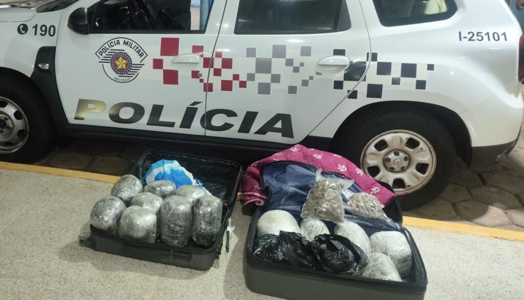 Durante patrulhamento, os policiais perceberam atitude suspeita e abordaram um ônibus interestadual. No compartimento de bagagens, sentiram forte cheiro de droga e identificaram duas malas pertencentes às passageiras.
