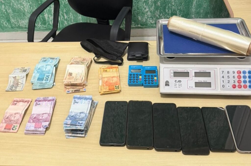 Durante o cumprimento de mandados de busca e apreensão domiciliar, foram apreendidos seis aparelhos celulares, uma balança de precisão, duas máquinas de pagamento eletrônico, um rolo de plástico filme, anotações manuscritas, contendo registros de valores e controle de vendas, além de aproximadamente R$ 8 mil.