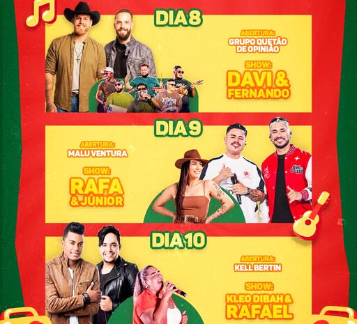 A programação foi pensada para agradar diferentes públicos, com apresentações que vão do sertanejo ao estilo mais popular, garantindo animação do começo ao fim em cada noite de festa.